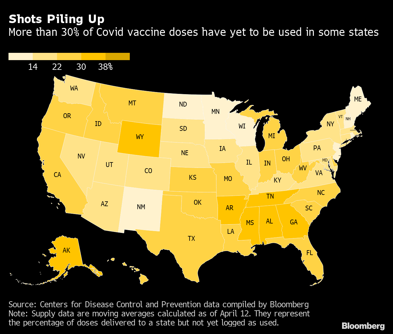 Bloomberg analyzed state and U.S. data from Monday, providing a snapshot of vaccine use before Johnson & Johnson shelved millions of shots pending federal health officials’ investigation into rare cases of blood clots. That pause will likely cause the number of unused shots to fluctuate, but will little change comparisons of states.