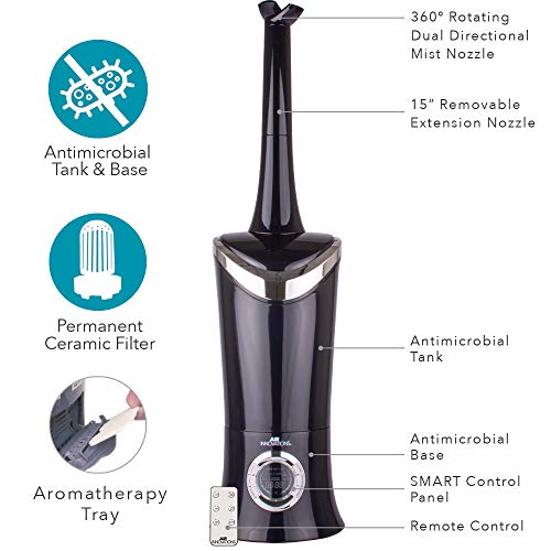 It has 5 mist settings, rotating mist nozzle, adjustable humidistat, and more