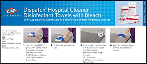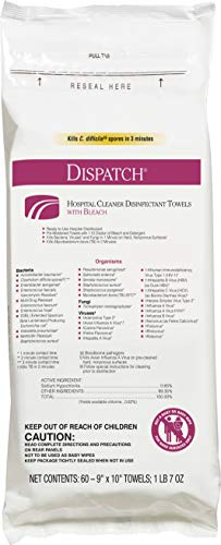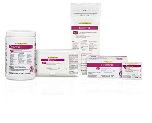 Dispatch Hospital Cleaner Disinfectant Towels with Bleach are intermediate-level hospital disinfectant wipes that meet CDC CMS and OSHA guidelines for cleaning and disinfecting surfaces in healthcare facilities. They are ready to use, 1 step cleaner-disinfectant wipes containing a 1:10 bleach dilution. These premoistened towels are EPA-registered to kill C. Difficile spores in 3 minutes and other common healthcare pathogens just 1 minute. These wipes kill 99.9999% of C. difficile spores, according to the current EPA recommended testing standard (June 2014). This is for clinical useage for disinfecting equipment and high-touch surfaces. These wipes feature an anticorrosion agent and are formulated for broad surface compatibility with healthcare surfaces including stainless steel, glass, plastic, porcelain, glazed ceramic, laminated surfaces and vinyl. Features a light fragrance for patient and staff comfort. Intended for use in Healthcare settings.