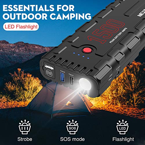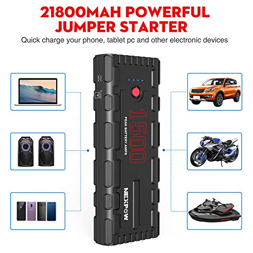 【SUPER CAPACITY AND PEAK】NEXPOW Upgraded auto battery charger jump starter used High-speed polymer battery instead of normal starter. With the super 1500A peak and 21800mah capacity, our car battery starter is easy to start a 12V vehicle up to 30 times (not only gas engine but also diesel engine). Also it could start trucks, motorcycles, snowmobiles, ATV, UTV, lawn mowers, and yachts up in a few minutes, even in extreme temperature(-4°F~140°F).