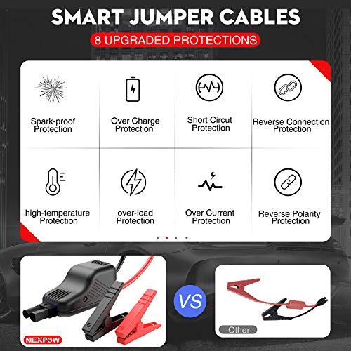 【IMPROVED SAFETY TECHNOLOGY】NEXPOW portable car battery jump starter have Intelligent jump cables built-in 8 upgraded protections, particularly spark-proof, reverse polarity protection, over-current protection, high-temperature protection, over-load protection. Flashing light and beep will tell you wrong operations.