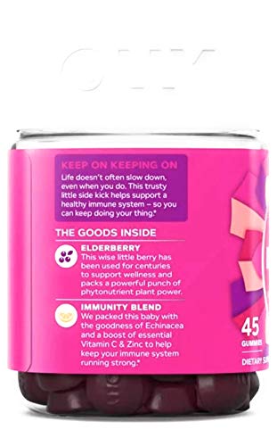 Elderberry: This wise little berry has been used for centuries to support wellness and packs a powerful punch of phytonutrient plant power.Immunity Blend: We packed this baby with the goodness of Echinacea and a boost of essential Vitamin C & Zinc to help keep your immune system running strong.Naturally Tasty: A sweet blend of berries and cherries.This trusty little side kick helps support a healthy immune system – so you can keep doing your thing.40 Gummies Each bottle, Berry Flavor, No Artificial Flavor or Color and Gluten Free.