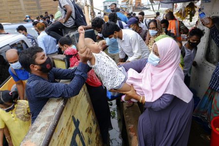 A child is handed over to board a ferry as people crowd a ferry terminal today to leave the city ahead of a lockdown set to start Thursday in Munshiganj, on the outskirts of Dhaka, Bangladesh. (AP Photo/Mahmud Hossain Opu)